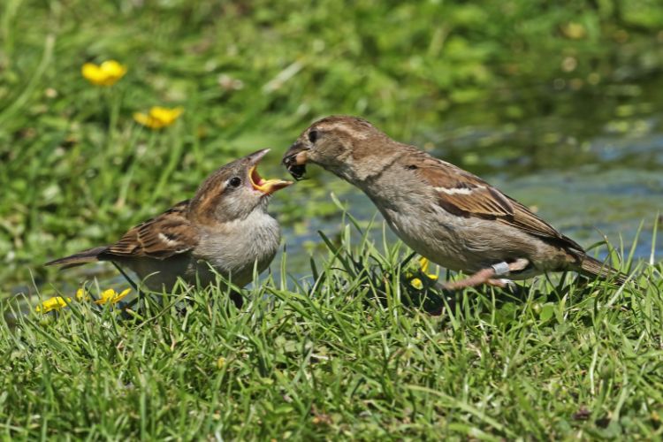 Jongen worden door zowel de vader als de moeder gevoerd. De ouders vliegen rond om insectjes te vangen en geven dit eten in een balletje aan hun jongen. Zo’n balletje bestaat uit 300-500 insecten en is lekker smeuïg gemaakt met speeksel. De jongen krijgen tot zo’n 20 balletjes per dag. Daarom is het maar goed dat hun snavel zo ver open kan!