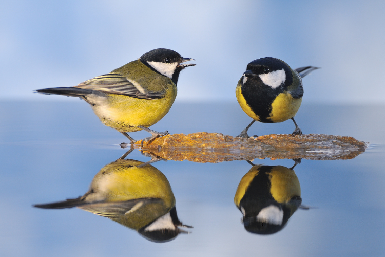 Links een mannetjes koolmees met een brede streep (stropdas) en rechts het vrouwtje met een smallere streep.