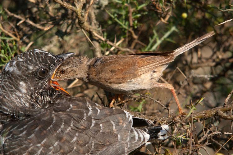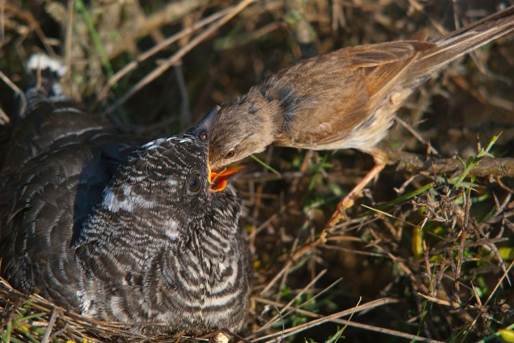 Een jonge koekoek wordt gevoed door zijn veel kleinere waardvogel.