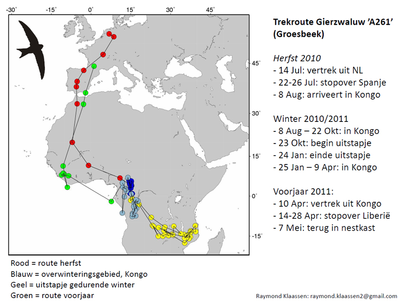 De gierzwaluw vliegt lange afstanden naar Afrika. De Nederlandse gierzwaluwen vliegen door naar Congo en zelfs naar Mozambique. Onderstaand kaartje laat de vluchtroutes zien.
