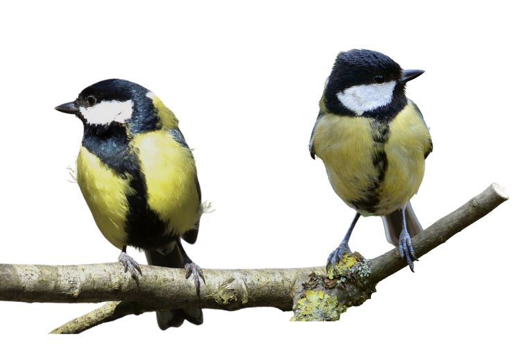 Links een mannetjes koolmees met een brede streep (stropdas) en rechts het vrouwtje met een smallere streep.